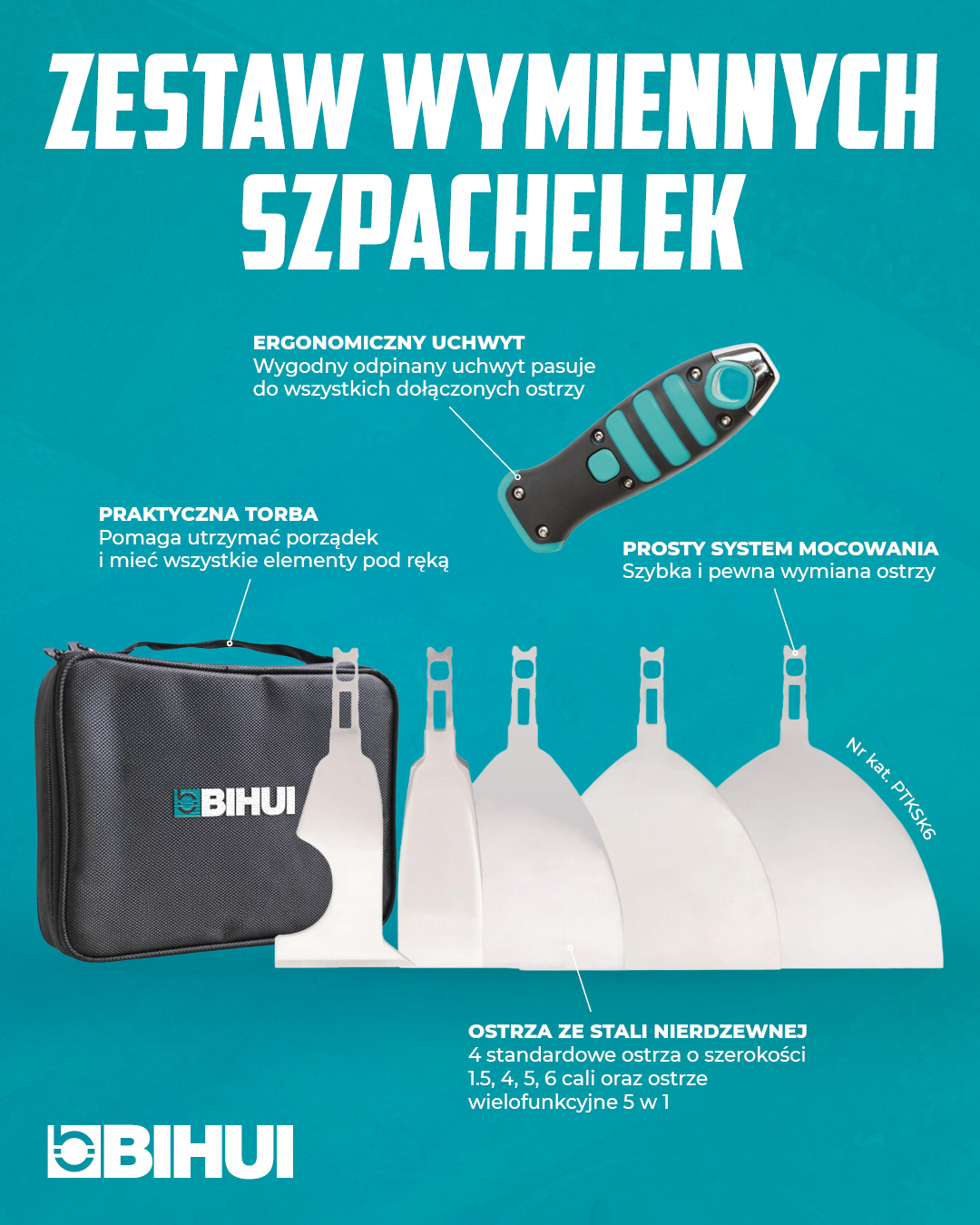 Zestaw wymiennych szpachelek BIHUI 6w1 to idealne rozwiązanie zarówno dla fachowców pracujących w różnych warunkach, jak i domowych majsterkowiczów ceniących sobie porządek w narzędziach.