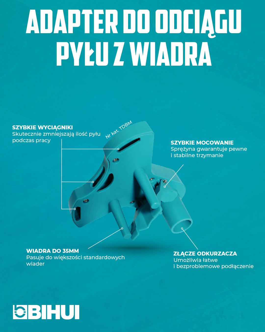 Adapter do odciągu pyłu do wiadra BIHUI to niezbędne akcesorium dla każdego fachowca ceniącego higienę pracy, szybkość działania i uniwersalność sprzętu.